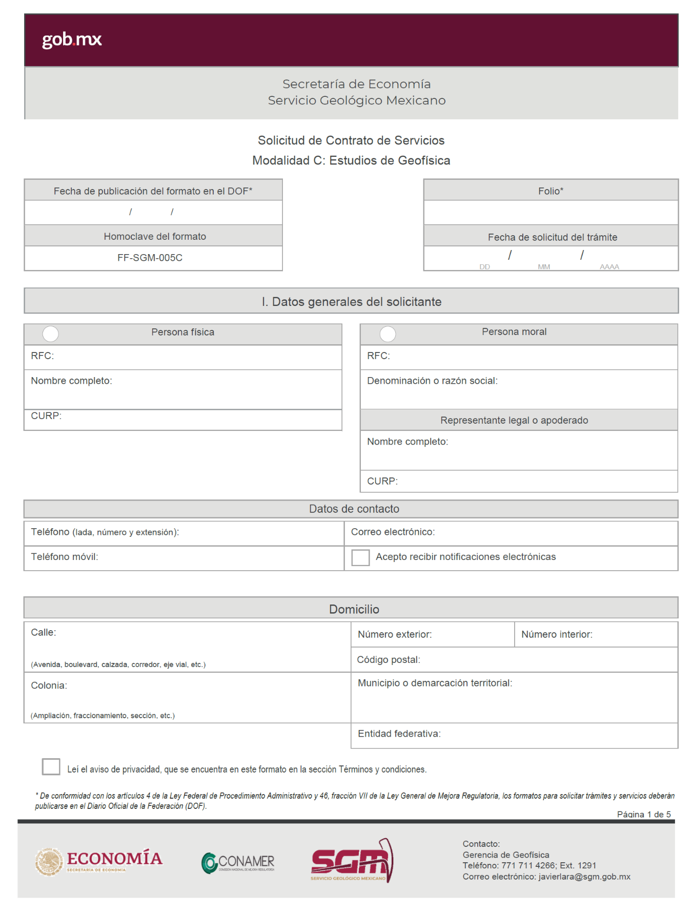 ARTÍCULO SÉPTIMO. Se establece el Formato con homoclave FF-SGM-005C para el servicio SGM-00-002 "Contrato de servicios" en su modalidad C) "Estudios de Geofísica", mismo que se integra como ANEXO CUATRO.