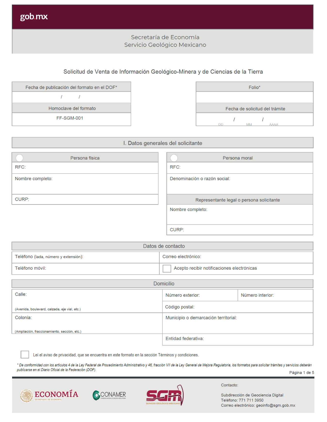 ARTÍCULO DÉCIMO. Se establece el Formato con homoclave FF-SGM-001 para el servicio SGM-00-006 "Venta de Información Geológico-Minera y de Ciencias de la Tierra", mismo que se integra como ANEXO SIETE.