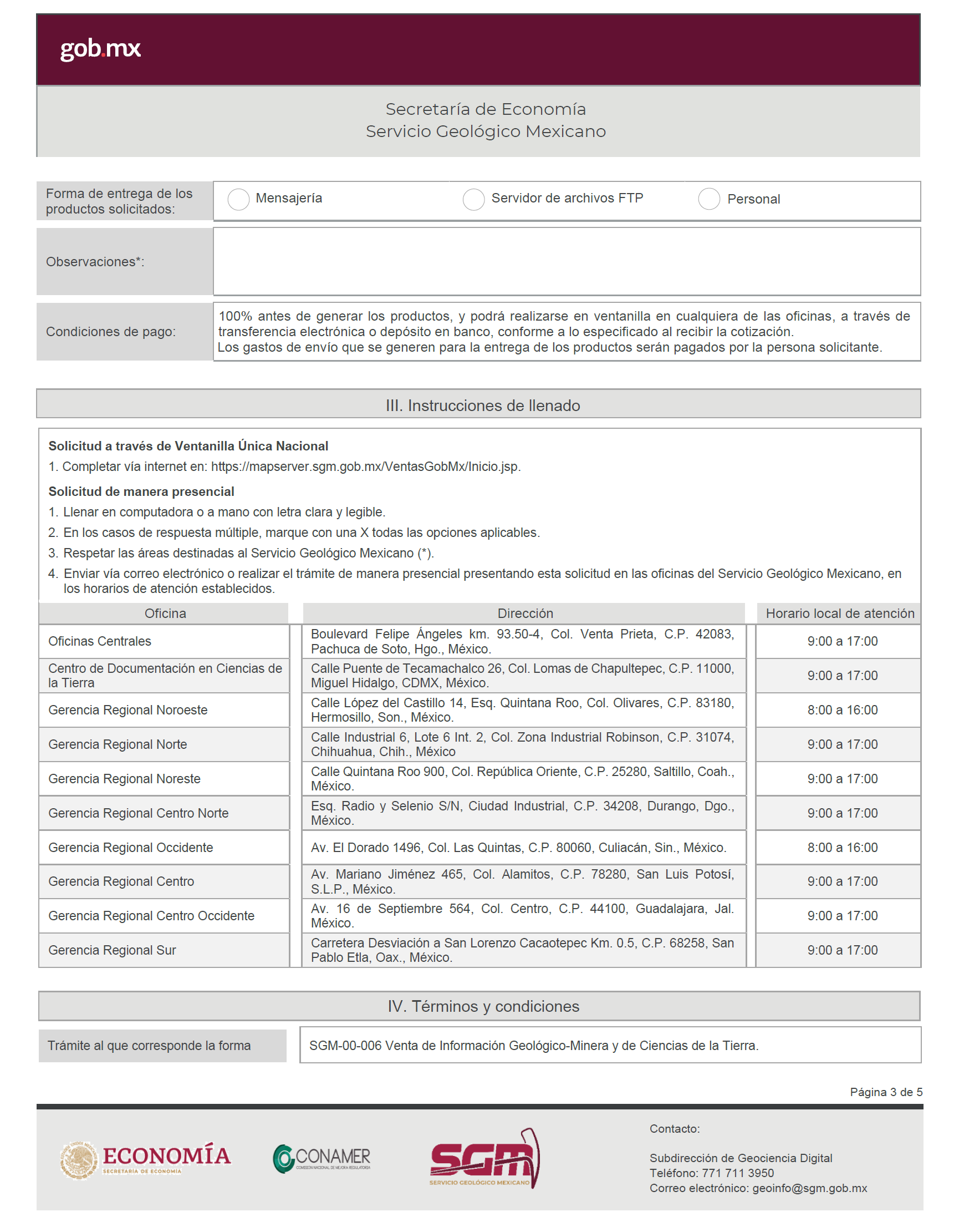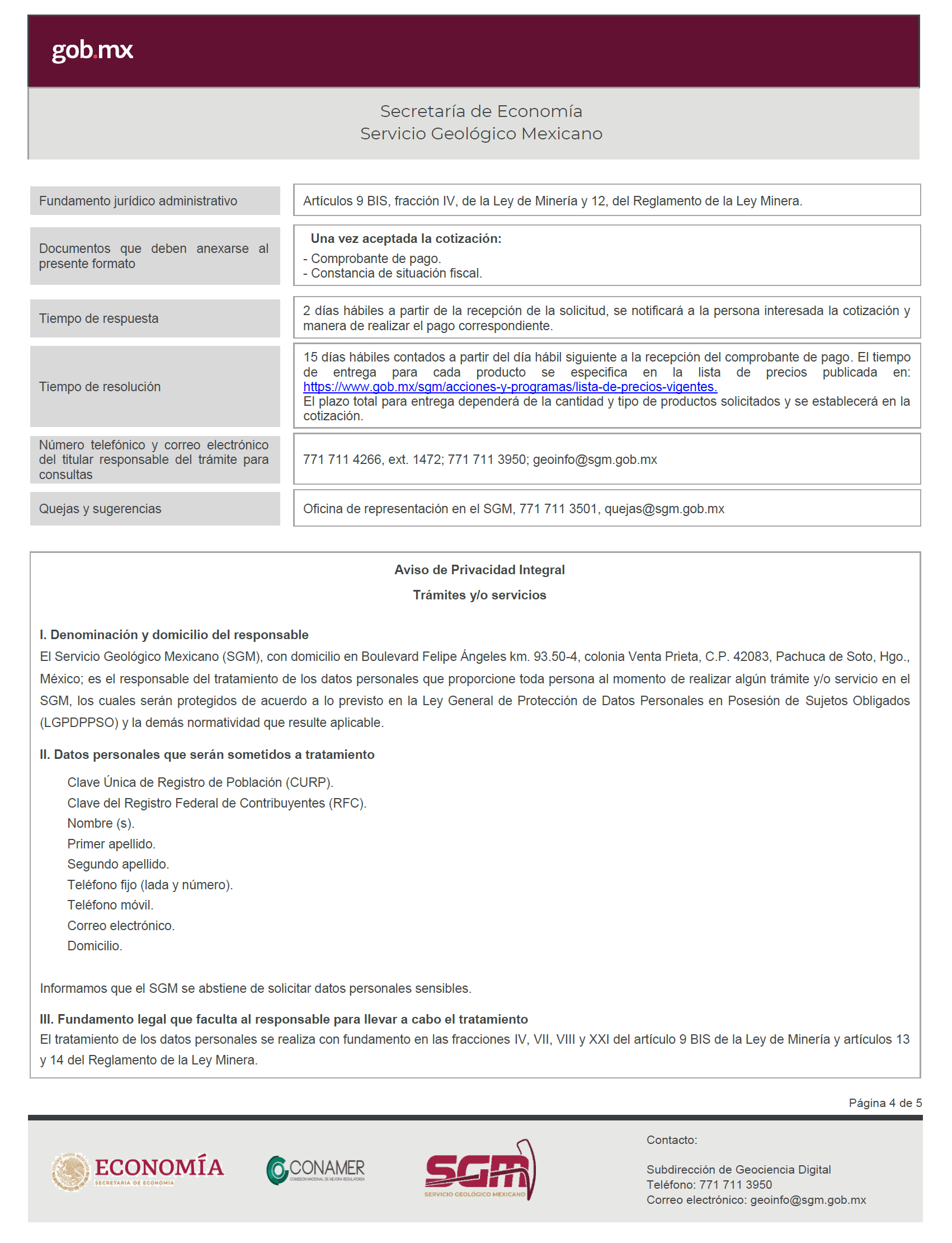 | 3 | SGM-00-006 | Venta de información geológico-minera y de ciencias de la tierra. | Se ajustan los plazos de respuesta y se reducen los plazos máximos de resolución. | Plazo máximo para que la autoridad resuelva su solicitud: 17 días hábiles (2 días para respuesta + hasta 15 días para entrega del producto). |