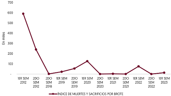 343. Asimismo, la Secretaría observó que las medidas implementadas por el SENASICA muestran que al estimar el índice muertes y sacrificios por brote se ha observado una baja significativa, tal como se muestra en la siguiente gráfica: