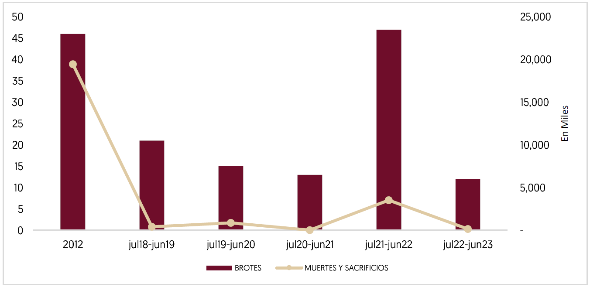 311. Bachoco y la UNA indicaron que existe un cambio de circunstancias al comparar lo ocurrido en agosto de 2012 con el periodo de revisión julio 2022 - junio 2023. Señalaron que en respuesta al brote epidémico de 2012, el Servicio Nacional de Salud, Inocuidad y Calidad Agroalimentaria, en adelante SENASICA, implementó una serie de medidas sanitarias y contra epidémicas para controlar los brotes y minimizar el impacto en la avicultura nacional: sacrificio sanitario, despoblación inmediata de los predios afectados y disposición sanitaria de los cadáveres in situ, cuarentena total y condicionada, restricción de los movimientos en el interior del país, tamizaje, zonificación, desinfección de áreas afectadas cumplimiento de un periodo de vacío sanitario hasta demostrar la ausencia del agente etiológico mediante centinelización, establecimiento de un área de riesgo perifocal de 10 km de los focos, y la vacunación en respuesta al brote. Las acciones emprendidas, así como el inicio de un programa de vacunación oficial y temporal de aves bajo riesgo, en donde se aplicaron un total de 165.9 millones de dosis de vacunas llevó a que el 16 de noviembre de 2012, el evento de IAAP H7N3 se considerara erradicado.