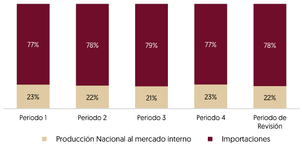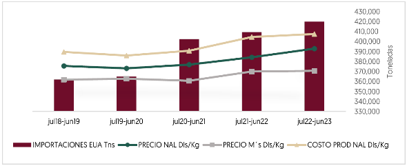 b. Las importaciones de pierna y muslo de pollo originarias de los Estados Unidos mantuvieron su crecimiento tanto en términos absolutos como relativos con respecto al CNA y la producción nacional de pierna y muslo de pollo. Además de que, representaron el principal origen de las importaciones y fueron el principal proveedor del mercado nacional.
