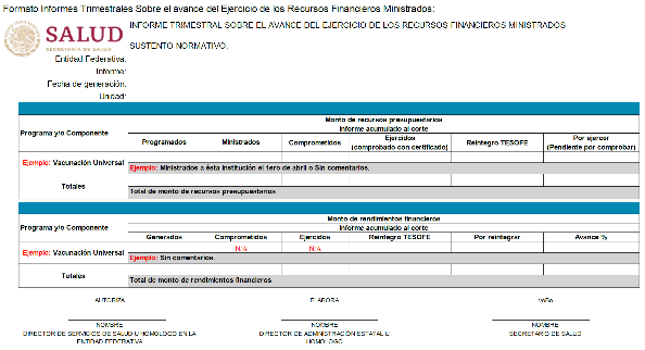 | | SUBSECRETARÍA DE POLÍTICAS DE SALUD Y BIENESTAR POBLACIONAL UA/OAD: . PROGRAMA: . Ejercicio Fiscal: . Entidad Federativa: . |