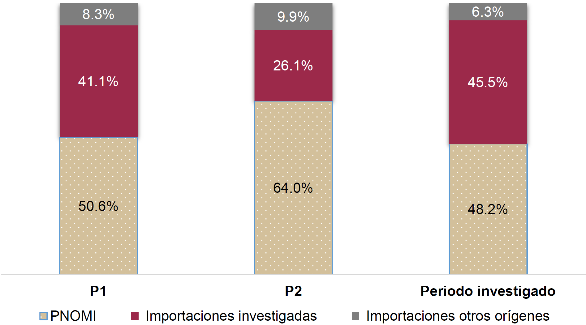 b.    Considerando el desempeño que tuvo el mercado nacional, descrito en el punto anterior, las importaciones del producto objeto de investigación fueron las únicas que se beneficiaron, en detrimento de la rama de producción nacional y de las importaciones de otros orígenes, al haber incrementado su participación en el CNA en 4.4 y 19.4 puntos porcentuales en el periodo analizado e investigado, respectivamente. En tanto que, en el consumo interno, su participación se incrementó en 2 y 19 puntos porcentuales en los mismos periodos, respectivamente.