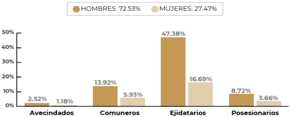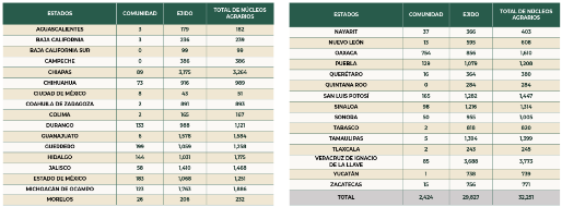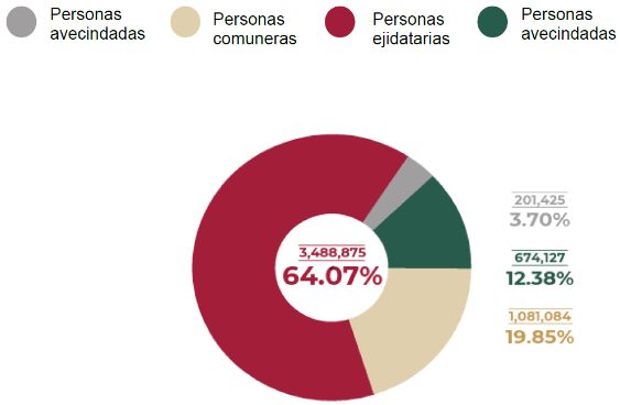 Una de las realidades a destacar es la distribución de la tierra por tipo de propiedad. De conformidad con el Atlas de la propiedad social de la tierra en México 2024, de la superficie continental de México, 50.8% se considera propiedad social, 42% propiedad privada y 7.2% terrenos nacionales, colonias agrícolas y ganaderas. Dentro de la propiedad social se constituyen 29,827 ejidos y 2,424 comunidades, sumando un total de 32,251 núcleos agrarios. Esta estructura de la tenencia de la tierra en nuestro país, y única en el mundo, insta a revisar y revalorizar la política nacional agraria, toda vez que, a pesar de la riqueza natural y cultural ahí contenidas, persisten fuertes rezagos en cuanto al acceso a derechos sociales, de propiedad, de organización y desarrollo de sus pueblos y comunidades.