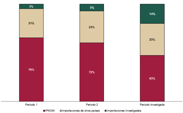 172. En lo que respecta a la participación en el mercado interno, de acuerdo con lo descrito en los puntos 151 y 152 de la presente Resolución, la contribución de la PNOMI en el CNA pasó del 76% en 2022 al 72% en 2023 y 63% en el periodo investigado, lo que representó una caída de 13 puntos en el periodo analizado y 9 puntos en el periodo investigado. Al respecto, la Secretaría considera que la caída observada en el periodo investigado se explica por el aumento en la contribución de las importaciones investigadas que también fue de 9 puntos porcentuales. Lo anterior, en tanto que las importaciones de otros orígenes mantuvieron constante su contribución de 23% en el mercado en 2023 y el periodo investigado.