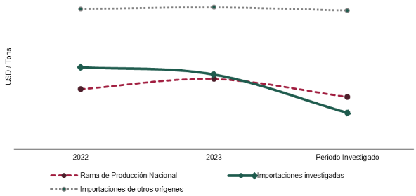 c. Los precios de las importaciones investigadas mostraron un comportamiento decreciente con una caída de 46% en el periodo analizado y 41% en el periodo investigado, situación que se reflejó en una depresión del precio de venta al mercado interno de la rama de producción nacional de 10% y 20% en los mismos periodos, respectivamente, para no perder mayor participación de mercado. Ello no impidió que, en el periodo investigado, el precio de las importaciones investigadas registrara una subvaloración de 19% en relación con el precio nacional. Lo anterior es un factor explicativo de los volúmenes crecientes y el aumento de participación en el mercado nacional de las importaciones objeto de investigación, que desplazarían a la producción nacional y a las ventas del mercado interno.