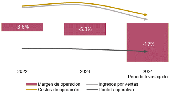 i. Un incremento de las pérdidas operativas de 226.7% en el periodo analizado, como resultado de una disminución en los ingresos por ventas de 31% y de los costos de operación de 22.1% en el mismo periodo, lo cual tuvo como consecuencia un incremento del margen operativo negativo de 13.4 puntos porcentuales, al pasar de -3.6% en 2022 a -17% en el periodo investigado.
