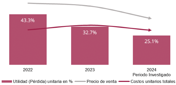 191. A partir de lo anterior, la Secretaría observó que el precio de venta del producto similar, expresado en pesos, disminuyó en mayor proporción que los costos unitarios totales durante el periodo analizado e investigado. Derivado de este comportamiento, la utilidad unitaria disminuyó 18.2 puntos porcentuales en el periodo analizado, al pasar de una utilidad de 43.3% en 2022 a 25.1% en el periodo investigado, tal como se observa en la siguiente gráfica: