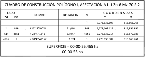 22. Que, el comisionado técnico del RAN y el comisionado agrario de la Sedatu rindieron el "informe de comisión de Trabajos Técnicos e Informativos de Expropiación", de 31 de octubre de 2024, en el que se señala que la superficie real a expropiar al ejido "Maxcanú", municipio de Maxcanú, estado de Yucatán, es de 00-00-55 ha, las cuales son de uso parcelado, que se describe en el siguiente plano y cuadro de construcción: