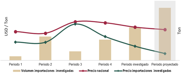 iii. El precio implícito de las importaciones investigadas presentaría una disminución de 24% en el periodo proyectado respecto del periodo investigado. Por su parte, el precio nacional registraría una caída de 5%. Lo anterior, llevaría a que los precios del producto chino con gastos de internación se ubiquen por debajo del precio nacional en 51%. El nivel creciente de subvaloración incentivaría la demanda por mayores importaciones de láminas de policarbonato de origen chino en el mercado nacional. En relación con el precio de las importaciones de otros orígenes, el precio de las importaciones investigadas presentaría niveles de subvaloración de 76% en el periodo proyectado.