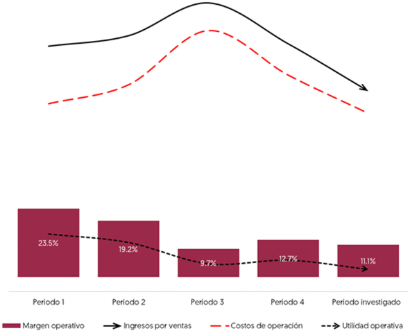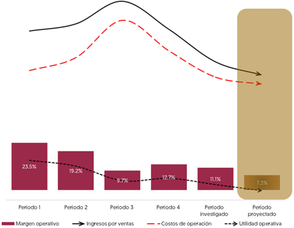 i. Tanto en el periodo investigado como en el periodo analizado, se registró una disminución en los ingresos por ventas en el mercado interno de 18% y 19%, respectivamente, y en resultados operativos de 61% y 29% en los mismos periodos, así como un deterioro del margen operativo de 12.4 en el periodo analizado y 1.6 puntos porcentuales en el periodo investigado, derivado de la caída en los ingresos por ventas en mayor medida que la disminución de los costos de operación, como consecuencia de la baja en los precios nacionales.