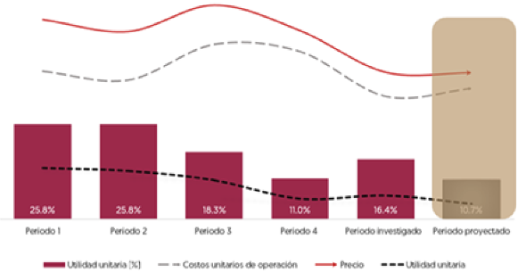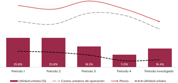 ii. Al separar el efecto del desplazamiento en el volumen de ventas nacionales a causa de las importaciones chinas, se observó que la caída en las utilidades operativas a nivel unitario (es decir, por kilogramo vendido) se debe principalmente al efecto de una depresión de los precios nacionales de la mercancía similar y, aunque los costos operativos también disminuyeron, no fue en la misma proporción que los precios, lo que significó un deterioro en la utilidad operativa por unidad durante el periodo analizado.
