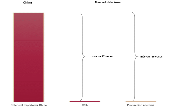 c. Señaló que el potencial exportador de China es 110 veces más que el CNA de México y 172 veces más que la producción nacional; el potencial exportador de China cubre holgadamente la probabilidad de aumento de las importaciones originarias de China en el periodo proyectado que asciende únicamente a 1,606 toneladas métricas, y representa apenas 0.14%; y la capacidad de producción de 39 empresas chinas es superior 275 veces en relación al CNA de México y 704 veces con respecto a la producción nacional en el periodo investigado.