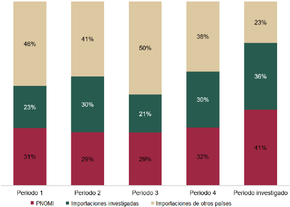 ii. En relación con el CNA, las importaciones objeto de investigación alcanzarían una participación de 49%, equivalente a un aumento de 13 puntos porcentuales con respecto al periodo investigado cuya participación fue de 36%. Por su parte, la participación de las importaciones del resto de orígenes, caerían a 15% con una pérdida de 8 puntos porcentuales con respecto al periodo investigado.