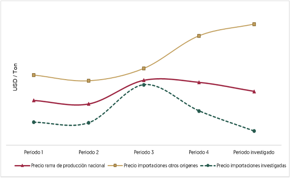 d. En el periodo analizado, el precio promedio de las importaciones investigadas se ubicó por debajo del precio de venta al mercado interno de la rama de producción nacional a niveles crecientes, situándose en 39% en el periodo investigado y con respecto al precio de otros orígenes en 63% en el mismo periodo.