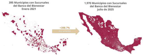 Con el propósito de cumplir con el mandato que dio origen al Banco del Bienestar, de asegurar la dispersión directa de apoyos a través de medios bancarizados y con ello garantizar el acceso a los servicios financieros de la población beneficiaria de los programas sociales, la institución ha fortalecido su presencia territorial mediante la expansión de su red de sucursales, priorizando su instalación en localidades históricamente excluidas por la banca comercial. Esta estrategia ha permitido eliminar intermediarios y reducir el uso de efectivo en la entrega de pensiones, becas y apoyos económicos.