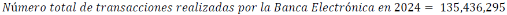 | Nombre variable 1 | Número de Transacciones realizadas por la Banca Electrónica del año 2024 | Valor variable 1 | 135,436,295 | Fuente de información variable 1 | Registros generados por BANJERCITO | ||||||||||||