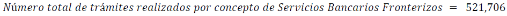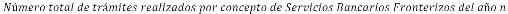 | Nombre | 4.1 Número total de trámites realizados por concepto de Servicios Bancarios Fronterizos. | ||||||||||||||||