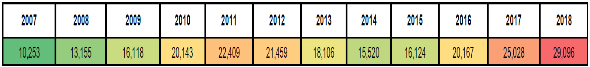 Número de homicidios dolosos registrados 2007-2018