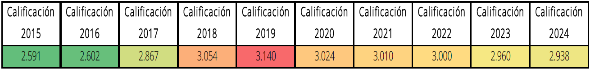 | Unidad de medida | Calificación promedio | Periodo de recolección de los datos | Enero - diciembre |