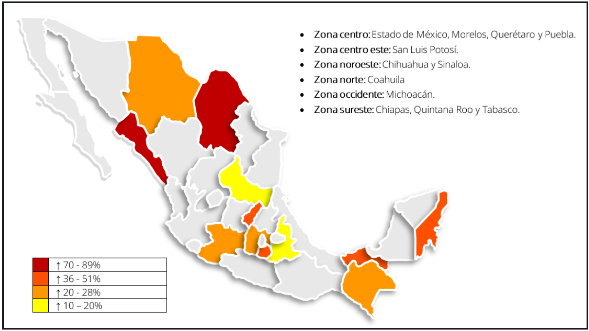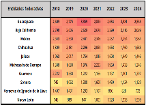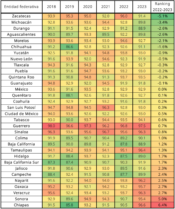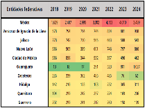 En contraparte, la estrategia de seguridad implementada después de 2018, permitió enfocar los esfuerzos institucionales en la actuación territorial del crimen. En 2023 y 2024, la incidencia con mayor índice porcentual de homicidio doloso se registró en: Tabasco, Baja California Sur, Chiapas, Aguascalientes y Sinaloa.
