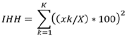 | Método de cálculo | Se obtiene la proporción de las exportaciones de cada subpartida respecto al total de México y se multiplica por 100. El resultado se eleva al cuadrado y se suma por el total de subpartidas del capítulo 1 al 97. Donde: IHH= Índice de Herfindahl Hirschman. k: es el bien en términos de subpartida arancelaria. K: puede llegar a alrededor de 5,000 subpartidas arancelarias de la Tarifa del Impuesto General de Importación y Exportación (TIGIE), del capítulo 1 al 97. X = exportaciones totales de México al mundo. xk = exportación de México al mundo, para cada una de las subpartidas arancelarias del capítulo 1 al 97. |