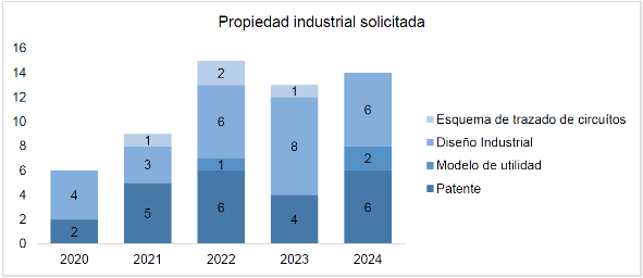 Estos resultados son importantes en el contexto nacional, donde solo 6.4% de las patentes otorgadas en 2024 fueron de titulares mexicanos. En la siguiente gráfica se muestran los resultados de protección industrial, número total de patentes, modelos de utilidad, diseños industriales y esquemas de trazado de circuitos en los últimos cinco años.