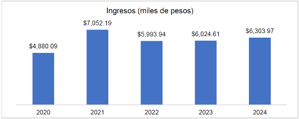 Los ingresos de la DTI han mostrado una estabilidad relativa en torno a los seis millones de pesos en los últimos cinco años, lo que sugiere una estructura financiera funcional, pero aún limitada frente a su potencial. Esto se relaciona con otro de los retos identificados: la necesidad de ampliar la retribución social de sus actividades. Sin embargo, el crecimiento de los proyectos de innovación se ha visto limitado por la poca participación del personal de investigación y del estudiantado, así como por una carga administrativa excesiva que ralentizan los procesos internos y reduce la eficiencia operativa, haciendo que el tiempo de respuesta ante oportunidades de colaboración con la industria o instituciones académicas sea poco competitivo, dando como resultado un bajo crecimiento de las actividades de desarrollo tecnológico e innovación. Además, mejorar el impacto social del CIO es un reto pendiente. En la siguiente gráfica se muestran los ingresos propios en los últimos cinco años.