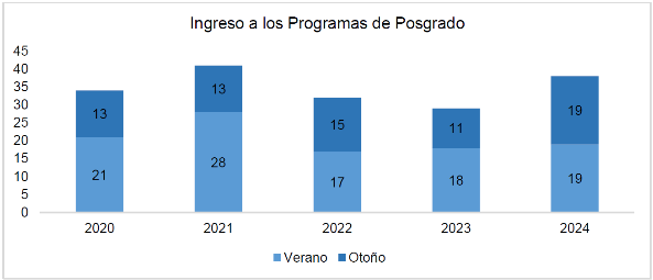 Estamos convencidos que la publicidad más eficaz y eficiente es la que se hace de boca en boca y son nuestras egresadas y egresados la mejor carta de presentación. Se debe hacer un mejor esfuerzo por encontrar y acercarse a las personas egresadas de los posgrados del CIO. Continuar o restablecer la comunicación con ellas, saber sobre su estatus actual y sus intereses, lo que hacen actualmente (inserción laboral o trayectoria académica) y de qué manera podemos aumentar la colaboración tanto en investigación, formación de la comunidad científica y tecnológica o labores de difusión de la ciencia. Establecer, cuando sea posible, convenios de colaboración que nos incentive a realizar trabajo conjunto. Estar al tanto de su desarrollo y en la medida de lo posible, cuando así lo requieran, apoyarles para que sigan avanzando. Tratar de generar sinergias de trabajo para que sean nuestros egresados quienes nos apoyen en la promoción de nuestro Centro. En la siguiente gráfica se muestra el ingreso a los programas de posgrado en los últimos cinco años.