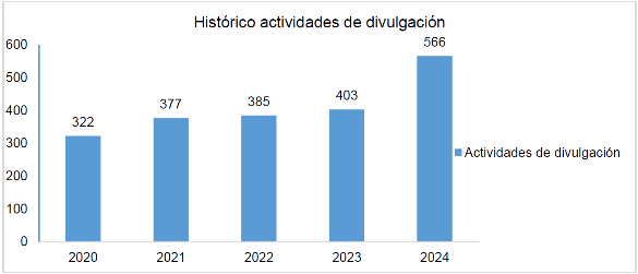 A partir de 2020 se emprendieron acciones orientadas a la reactivación y reconfiguración del Museo ILUMINA: Ana María Cetto y del Planetario Manuel Peimbert Sierra como un espacio de divulgación científica abierto a la sociedad. Estos espacios significan un incremento en el alcance de actividades y participantes. En la siguiente gráfica se muestra el incremento del número de actividades de divulgación de los últimos cinco años, el aumento significativo del año 2023 al año 2024 es debido a la apertura formal y la sistematización de visitas en el Museo durante esos años.