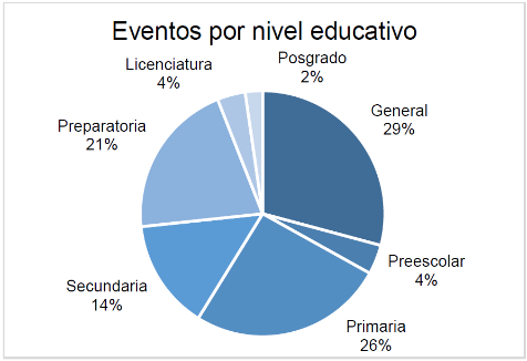La óptica y la astronomía son campos fundamentales que nos permiten comprender mejor el mundo y el universo que nos rodea. Al enseñar estos temas de manera accesible y atractiva, se enriquece la educación de las personas participantes y se fomenta una comprensión más profunda de fenómenos naturales importantes. La participación en actividades científicas promueve el desarrollo de habilidades críticas como el pensamiento analítico, la resolución de prioridades y la creatividad. Estas habilidades son valiosas no solo en el ámbito científico, sino en la vida cotidiana y en diversas carreras profesionales. En la siguiente gráfica se muestra la distribución por nivel educativos de los diferentes eventos de divulgación de la ciencia.