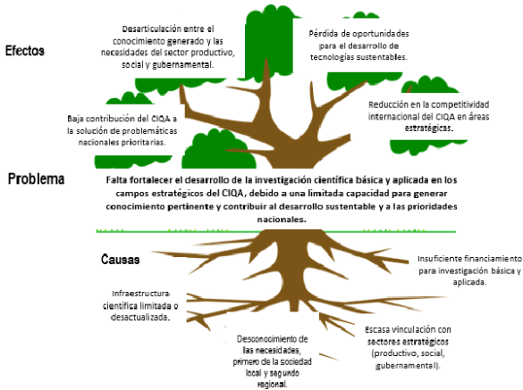 A través de la metodología del marco lógico, se realizó un análisis estructurado que permitió identificar los principales obstáculos que limitan el desarrollo pleno de las capacidades científicas del Centro. La construcción del árbol de problemas correspondiente reveló factores críticos como la insuficiencia de infraestructura y equipamiento especializado, la necesidad de consolidar líneas de investigación de frontera, y la escasa articulación entre la generación de conocimiento y las demandas específicas de los sectores productivo, social y gubernamental.