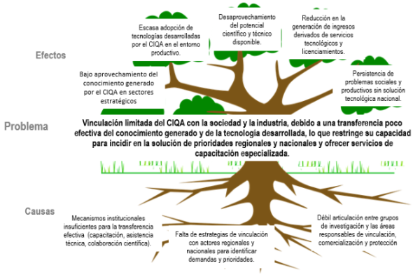 El árbol de problemas que se presenta en la figura 3, resume los hallazgos derivados de este análisis y permite visualizar las causas estructurales y los efectos asociados a la débil vinculación del CIQA con su entorno. Esta distinción fue clave para identificar barreras específicas, tanto estructurales como operativas, que impiden un aprovechamiento amplio del potencial científico y tecnológico del CIQA. El análisis evidenció la necesidad de fortalecer los mecanismos institucionales orientados a la interacción con sectores productivos, sociales y gubernamentales, a fin de incrementar la adopción de tecnologías desarrolladas en el Centro, ampliar la oferta de servicios de capacitación altamente especializada, y responder de manera proactiva a demandas concretas del entorno. Asimismo, se identificó una débil articulación entre las funciones de investigación y vinculación, lo que dificulta la transición del conocimiento desde el laboratorio hacia su aplicación en contextos reales, así como una limitada participación en redes de innovación, plataformas de colaboración multisectorial y esquemas orientados al logro de la soberanía tecnológica.