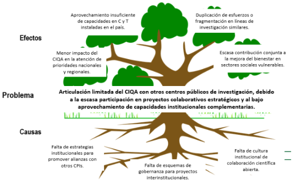 El árbol de problemas que se presenta en la figura 4, resume de manera estructurada los principales factores que obstaculizan la articulación del CIQA con otros centros públicos de investigación, así como los efectos negativos que esto genera en términos de impacto, eficiencia institucional y aprovechamiento del potencial científico nacional.