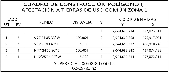 27. Que, el comisionado técnico del RAN y el comisionado agrario de la Sedatu rindieron el "informe de comisión de Trabajos Técnicos e Informativos de Expropiación", de 13 de febrero de 2025, en el que señalan que la superficie real a expropiar al ejido "Palmar", municipio de Othón P. Blanco, estado de Quintana Roo, es de 00-08-80 hectáreas de temporal de uso común, que se describen en el siguiente plano y cuadro de construcción: