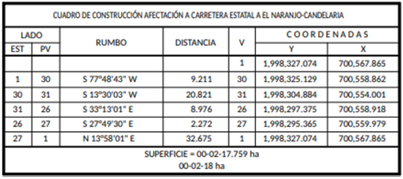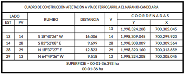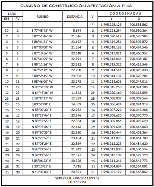 24. Que, el comisionado técnico del RAN y el comisionado agrario de la Sedatu rindieron el informe de comisión de Trabajos Técnicos e Informativos de Expropiación, de 10 de junio de 2024, en el que se señala que la superficie real a expropiar es de 00-20-66 hectáreas de temporal de las cuales 00-03-54 hectáreas son de uso común y 00-17-12 son de uso parcelado del ejido "Paraíso Nuevo", municipio de Candelaria, estado de Campeche, y se describe en el siguiente plano y cuadro de construcción: