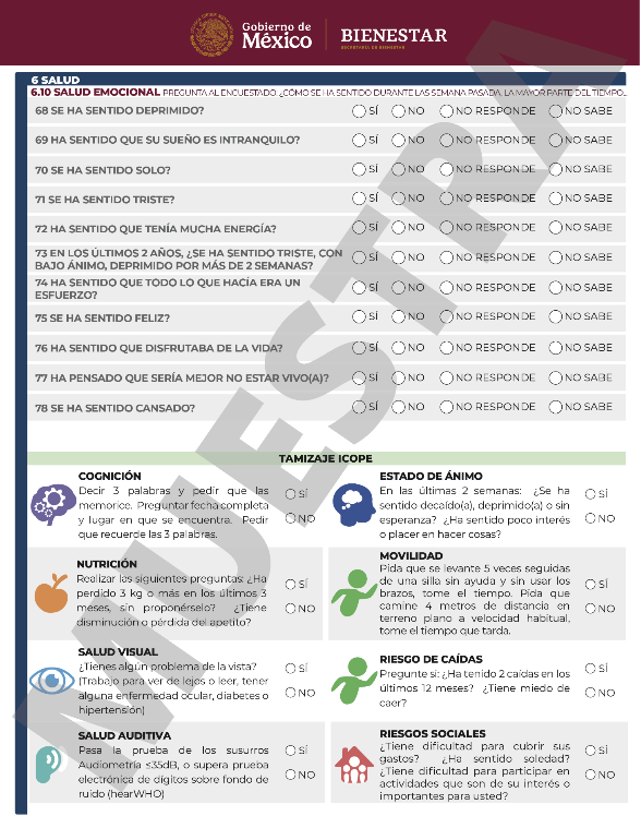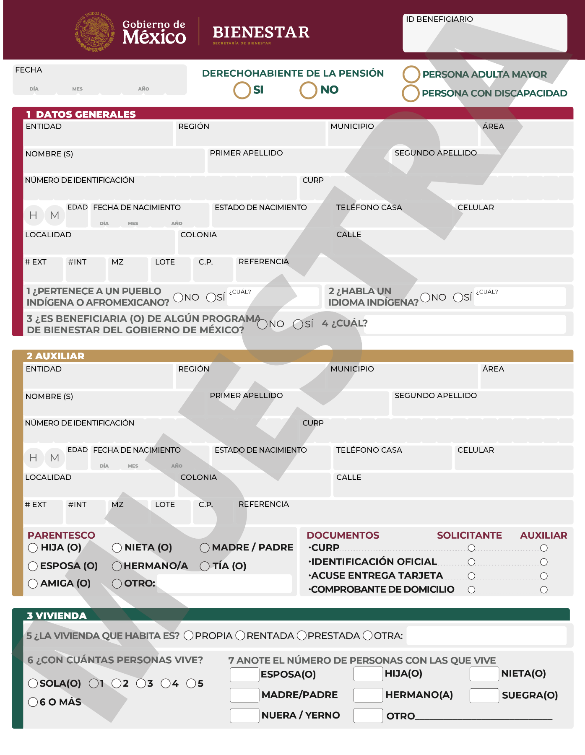 | 1. Persona Derechohabiente a. Ser derechohabiente del Programa Pensión para el Bienestar de las Personas Adultas Mayores (PPBPAM); o b. Ser derechohabiente del Programa Pensión para el Bienestar de las Personas con Discapacidad Permanente (PPBPDP). | Cumplir con los criterios de elegibilidad y presentar copia y original (para cotejo) de los documentos siguientes: 1. Documento de Identificación oficial vigente: - Credencial para votar. En caso de no contar con este documento, puede presentar pasaporte vigente o credencial del Instituto Nacional de las Personas Adultas Mayores (INAPAM), u otros documentos que acrediten identidad expedidos por la autoridad correspondiente. 2. Clave Única de Registro de Población (CURP). 3. Proporcionar información para el llenado del Cuestionario de Salud. |