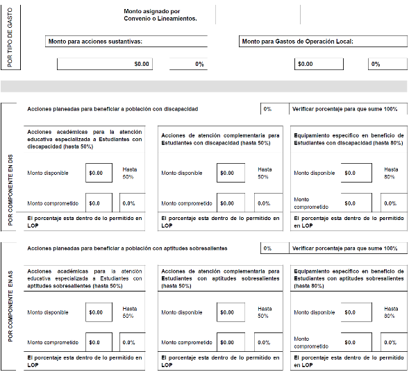 Criterios de gasto.- Son el conjunto de acciones que se describen al interior de cada uno de los componentes del PFSEE los cuales son: 1. Acciones académicas para la atención educativa especializada a Estudiantes con discapacidad o con aptitudes sobresalientes, 2. Acciones de atención complementaria para Estudiantes con discapacidad o con aptitudes sobresalientes y 3. Equipamiento específico en beneficio de Estudiantes con discapacidad o con aptitudes sobresalientes.