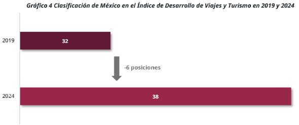 Asimismo, el turismo mexicano enfrenta una creciente competencia internacional, derivada del fortalecimiento de otros destinos turísticos que buscan ofrecer cada vez más experiencias diversificadas, así como infraestructura de calidad, lo que representa un reto importante para México al adaptarse y diferenciarse en un mercado altamente competitivo. En 2006, México se posicionó en la posición número 8 de entre los principales destinos en el mundo en función de la llegada de turistas, recibiendo 21.4 millones, seis años después, en 2012 bajó a la posición número 13; sin embargo, su preferencia ante el turismo internacional aumentó para colocarse, en 2018, en la posición número 7 y, para 2024, en el puesto número 6 recibiendo 45 millones de turistas (SECTUR, 2025).