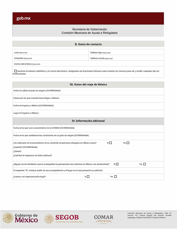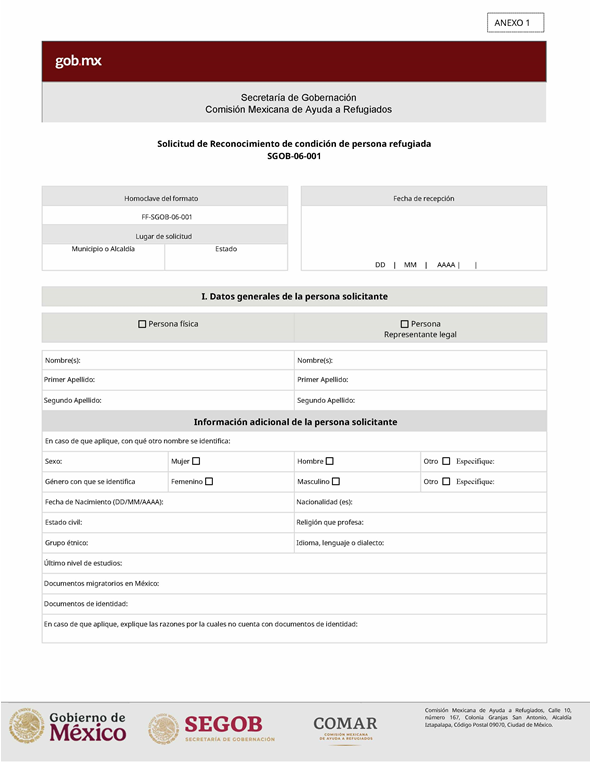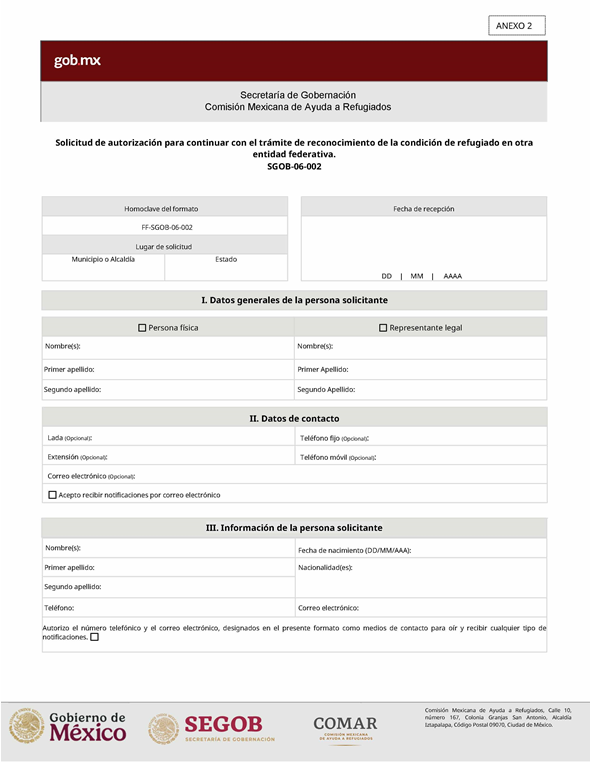 | 2 | SGOB-06-002 | Solicitud de autorización para continuar con el trámite de reconocimiento de la condición de refugiado en otra entidad federativa. | FF-SGOB-06-002 | Anexo 2 |