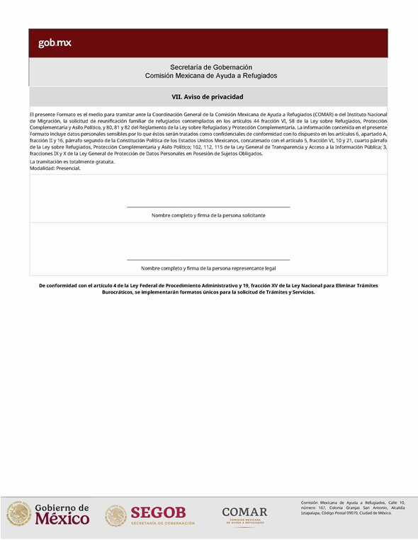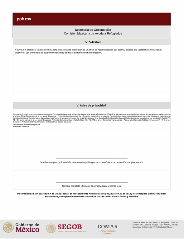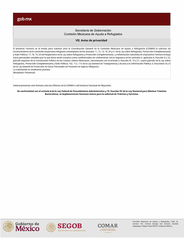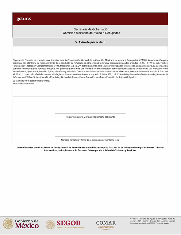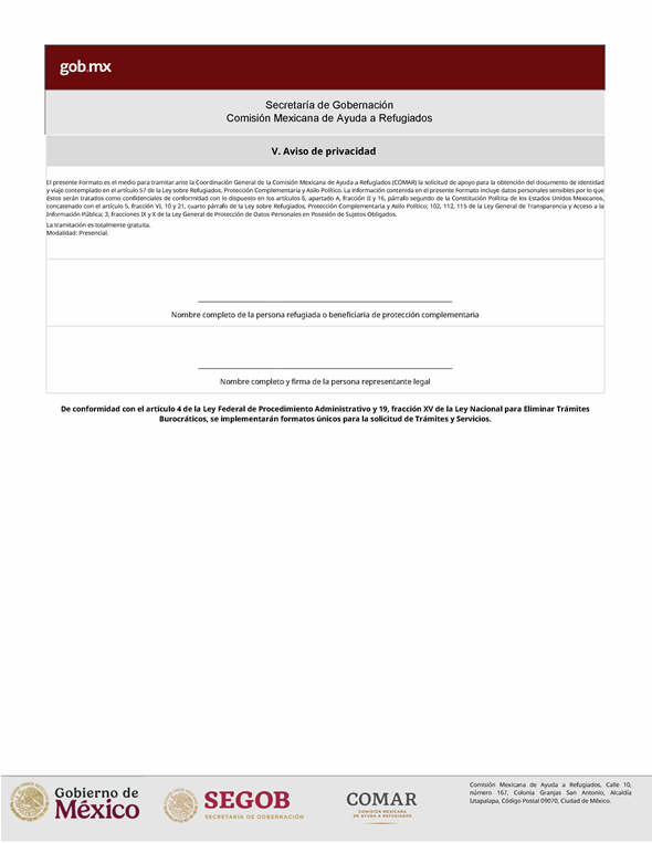 QUINTO.- Los formatos de solicitud implementados en los trámites con homoclave SGOB-06-001, SGOB-06-002 y SGOB-06-003 serán de apoyo, derivado de la naturaleza jurídica de los mismos, a fin de no condicionar a su llenado la atención de la Comisión Mexicana de Ayuda a Refugiados.