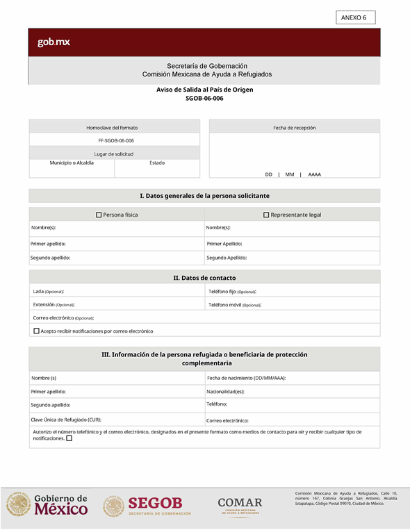 | 6 | SGOB-06-006 | Aviso de salida del país de origen. | FF-SGOB-06-006 | Anexo 6 |