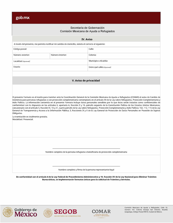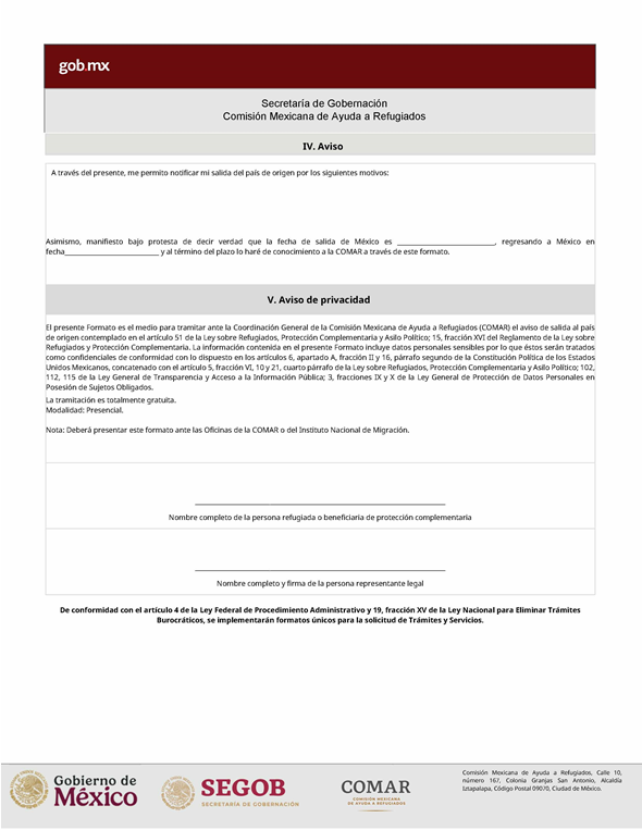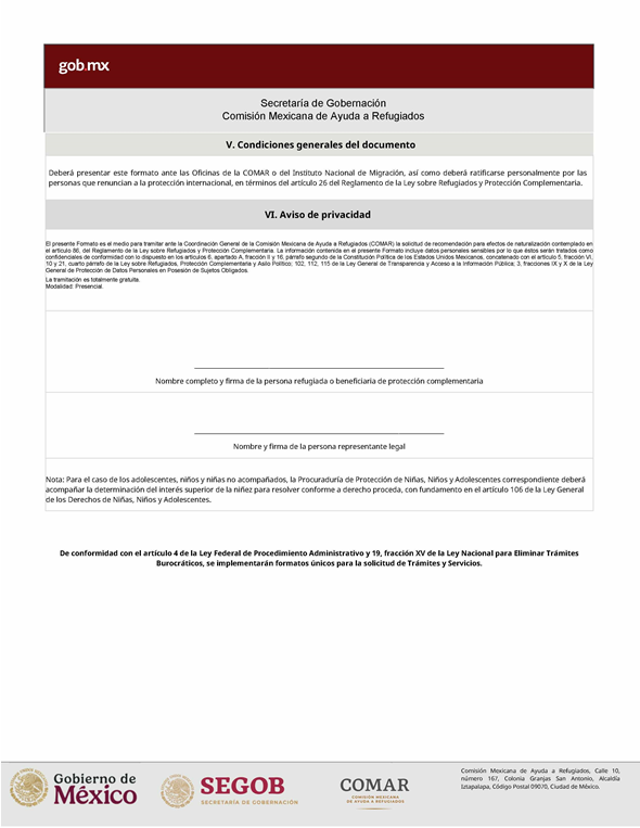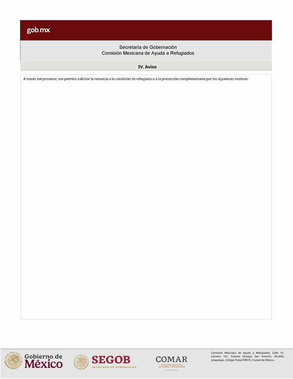 | 8 | SGOB-06-008 | Aviso de la renuncia a la condición de refugiado o a la protección complementaria. | Se eliminan los siguientes requisitos: 1. Escrito libre de solicitud. | 1. Formato de solicitud. |
