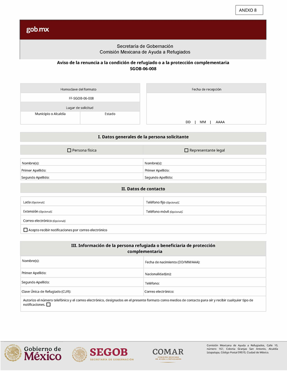 | 8 | SGOB-06-008 | Aviso de la renuncia a la condición de refugiado o a la protección complementaria. | FF-SGOB-06-008 | Anexo 8 |