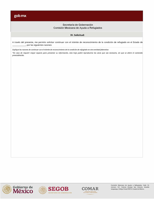 | 2 | SGOB-06-002 | Solicitud de autorización para continuar con el trámite de reconocimiento de la condición de refugiado en otra entidad federativa. | Se eliminan los siguientes requisitos: 1. Escrito libre de solicitud. 2. Escrito libre de solicitud. | 1. Formato de solicitud. 2. Pruebas que estime convenientes. |