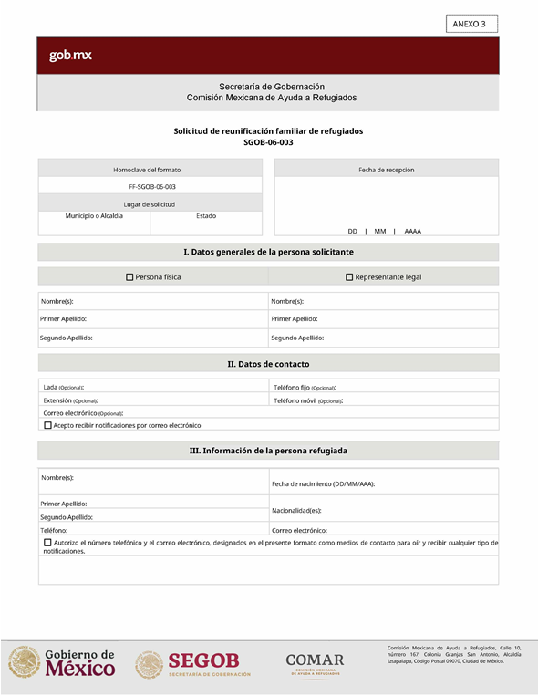 | 3 | SGOB-06-003 | Solicitud de reunificación familiar de refugiados. | FF-SGOB-06-003 | Anexo 3 |