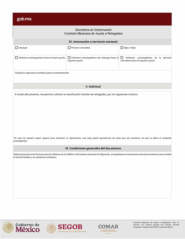 | 3 | SGOB-06-003 | Solicitud de reunificación familiar de refugiados. | Se eliminan los siguientes requisitos: 1. Anexar la solicitud individual de la evidencia que acredite el vínculo familiar y su solvencia económica. | 1. Formato de solicitud. 2. Evidencia que acredite el vínculo familiar y su solvencia económica. |