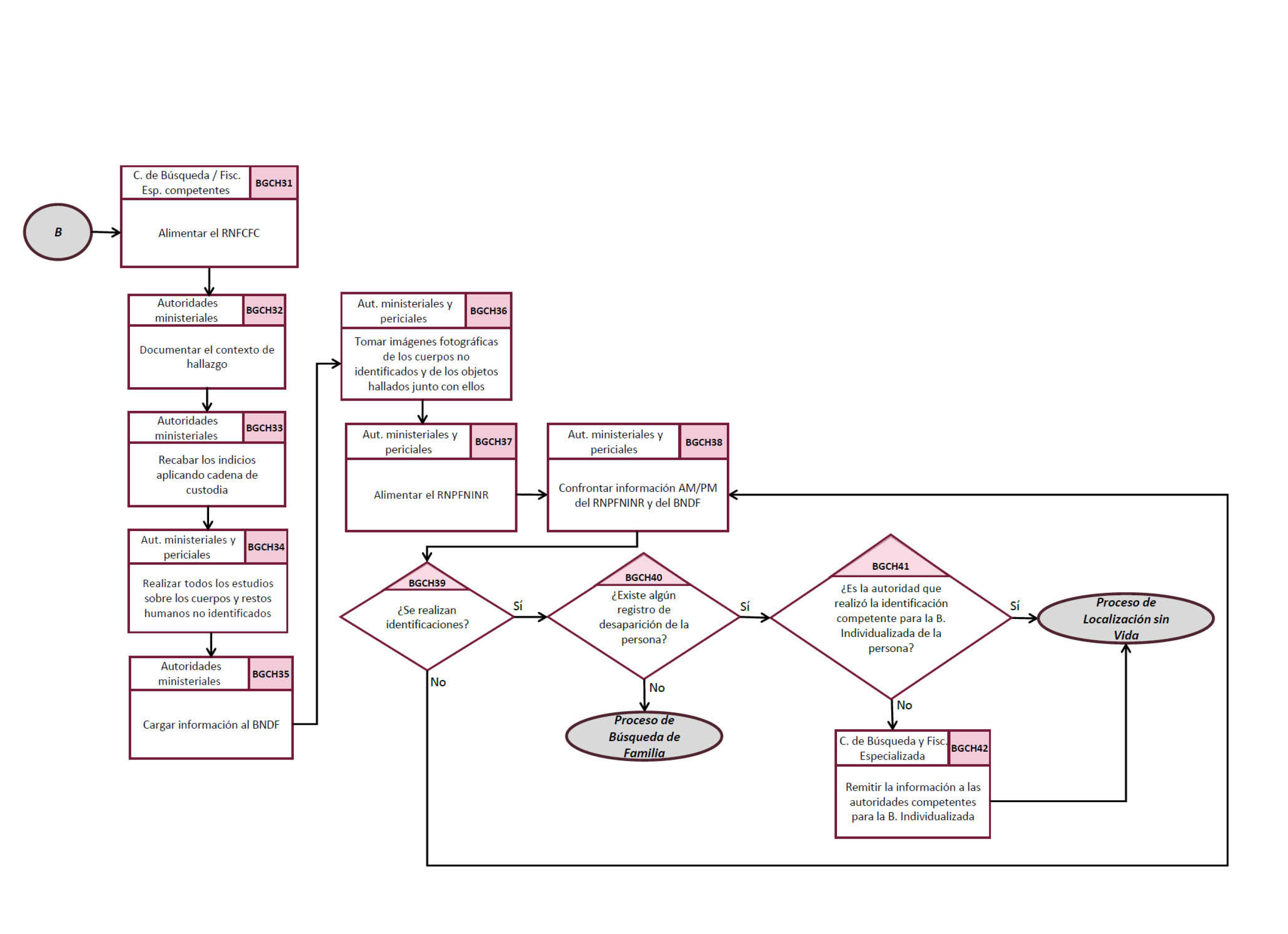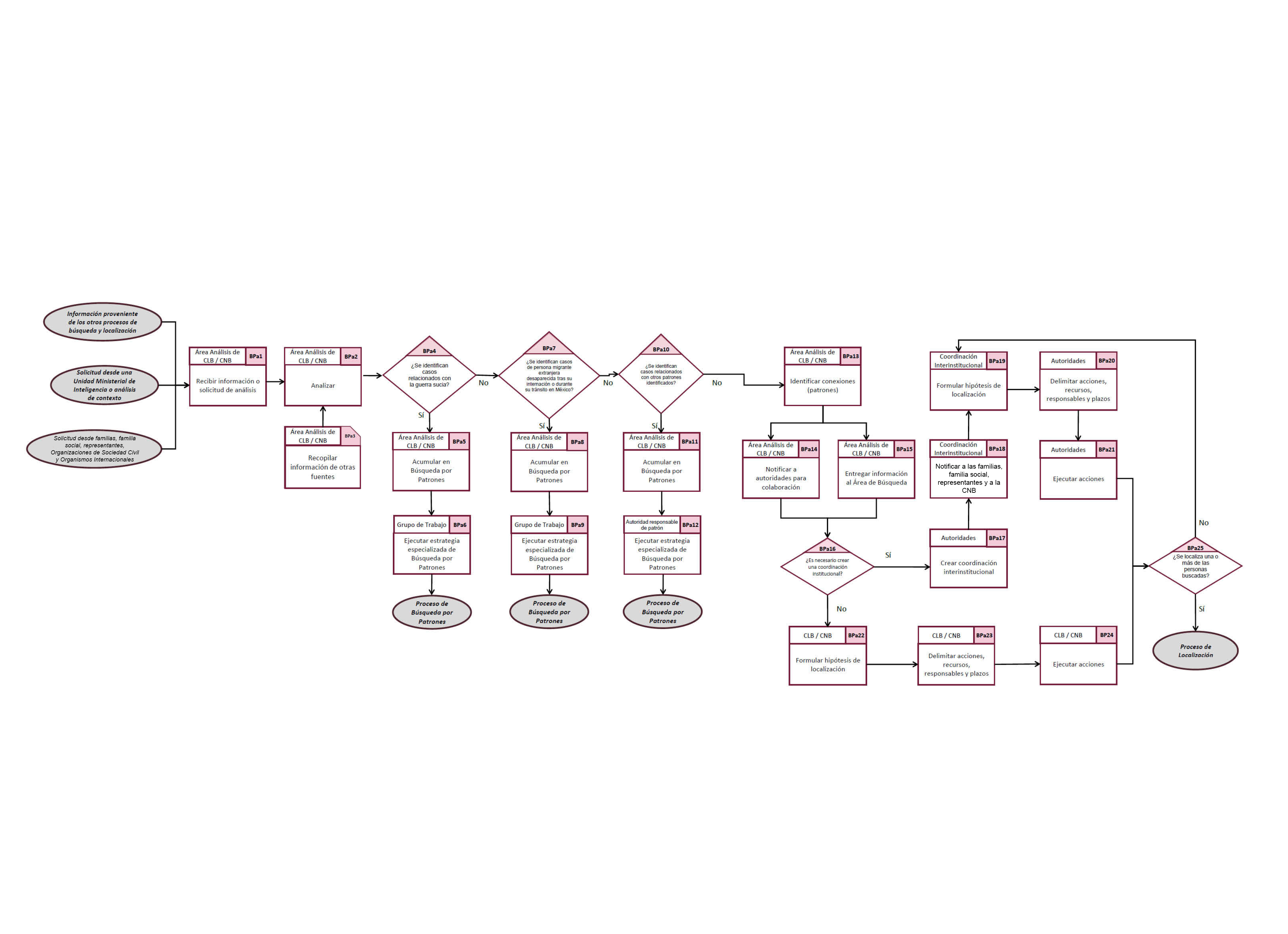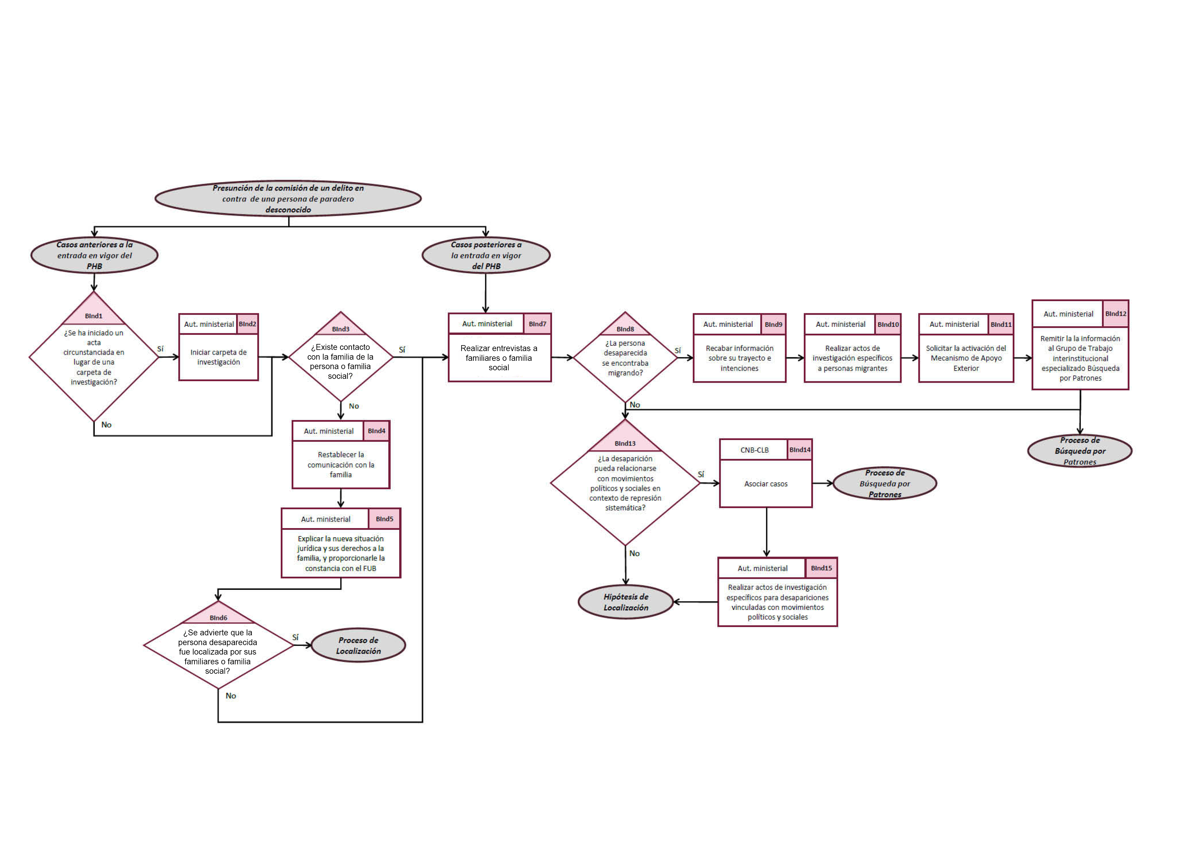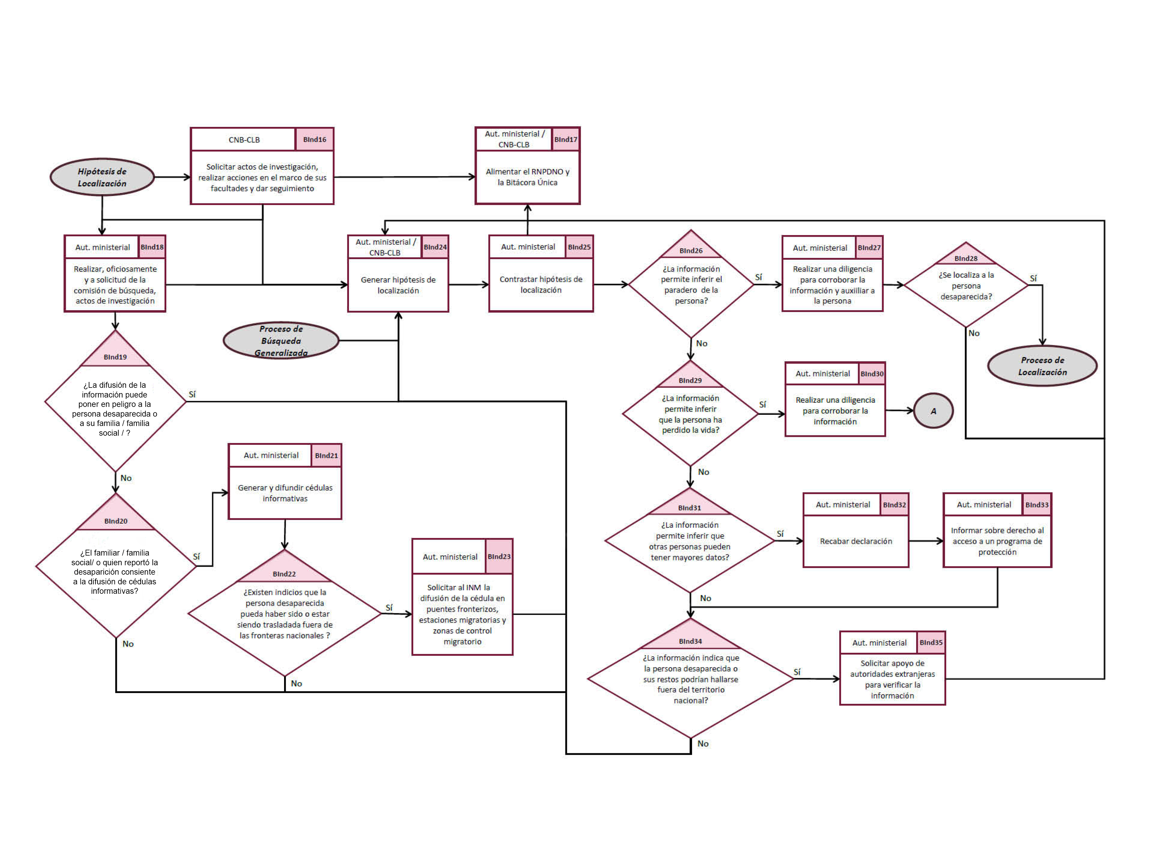 Agotados los análisis de documentación y de campo, se inició con los trabajos de construcción de las bases del protocolo a partir de un modelo de diseño de procesos organizacionales, es decir, del desarrollo de un macroproceso general para la búsqueda de personas, el cual implicó la delimitación de funciones, procesos y relaciones formales con el propósito de definir etapas.