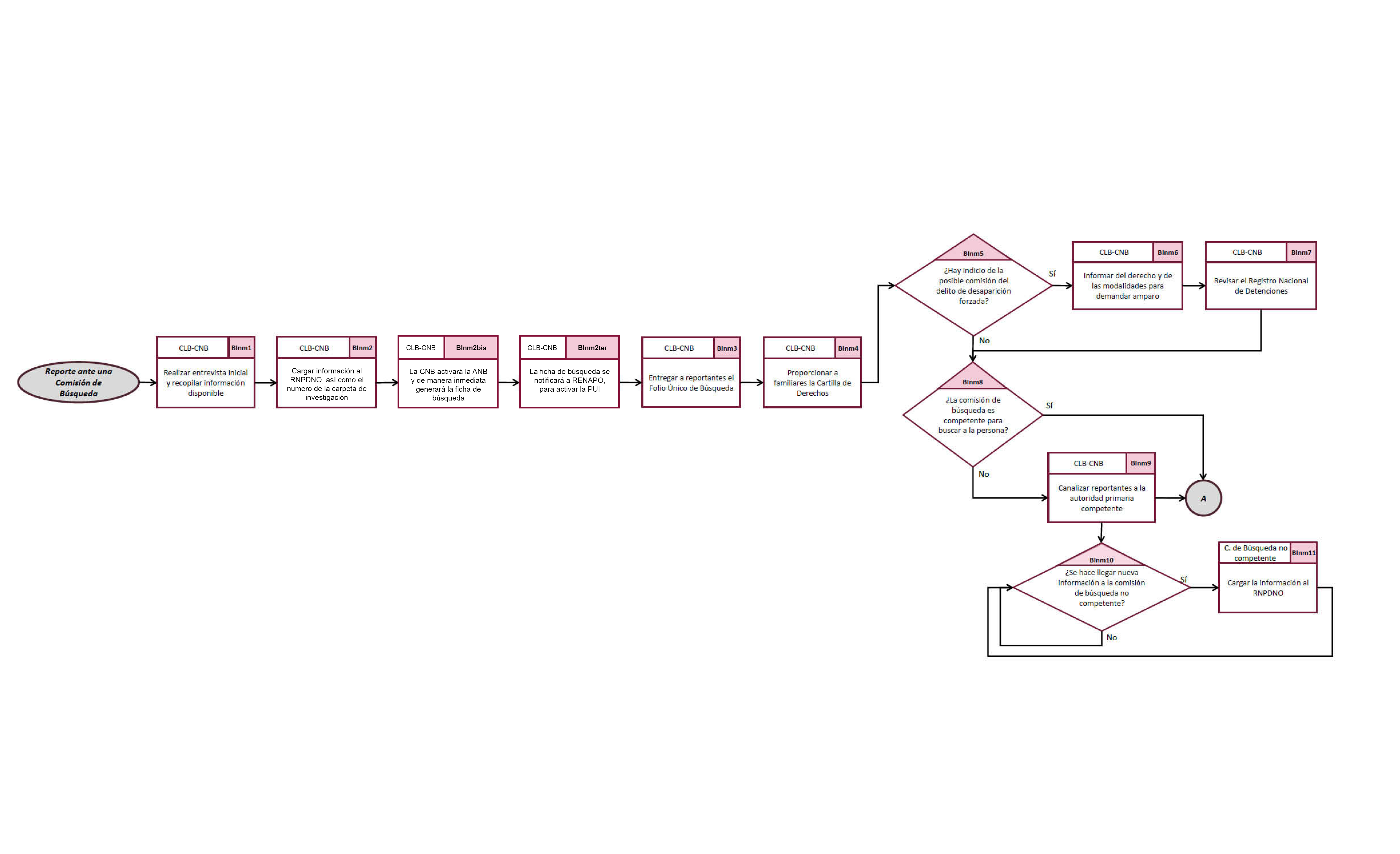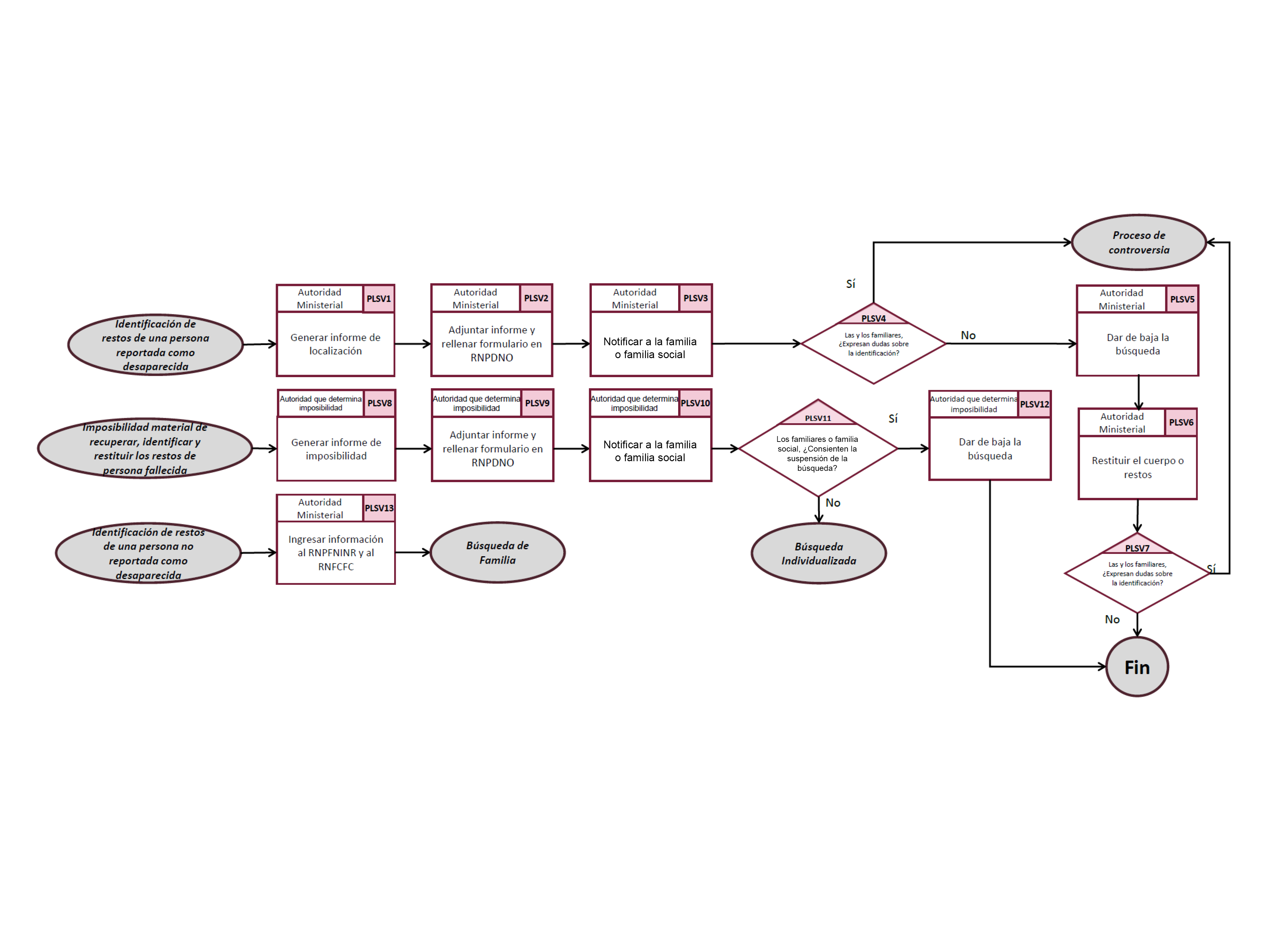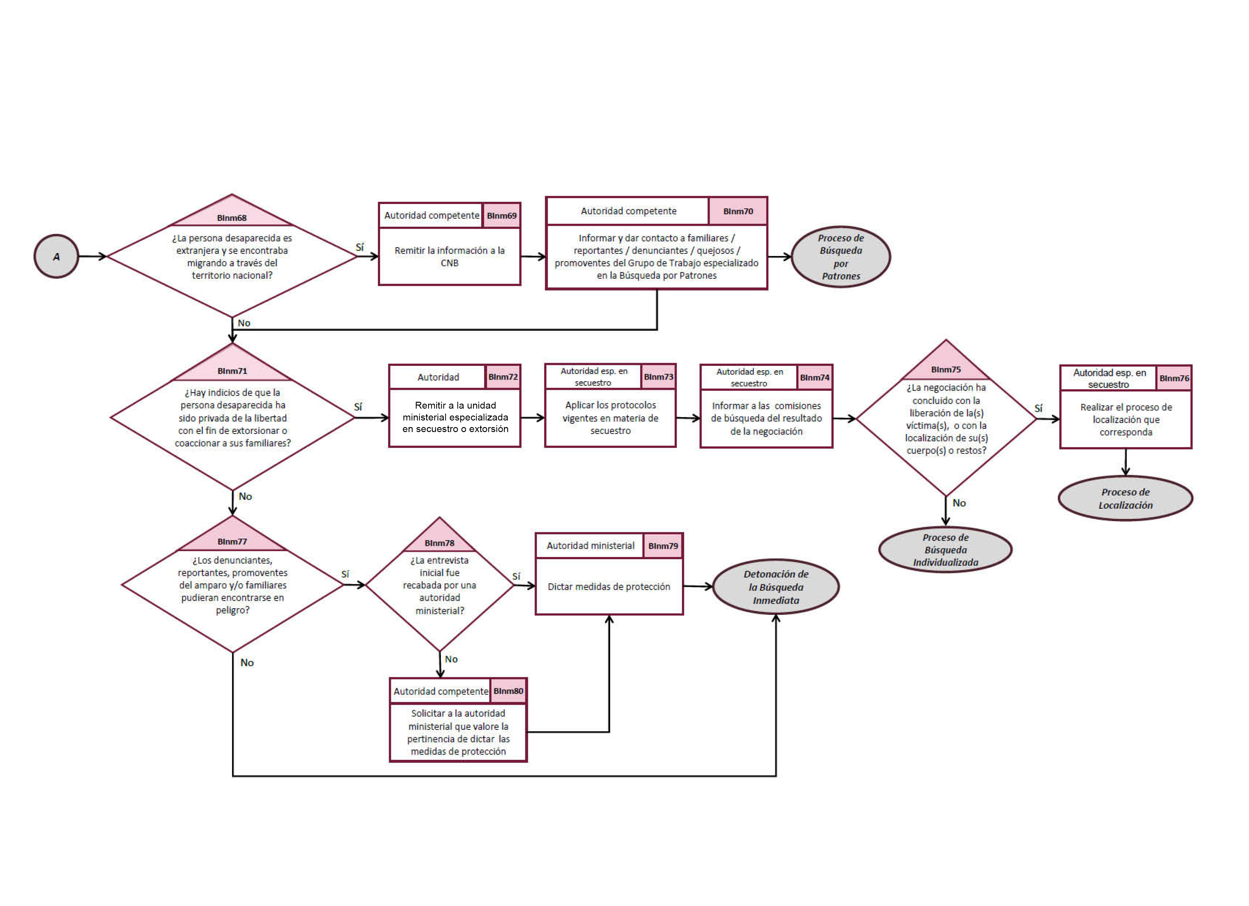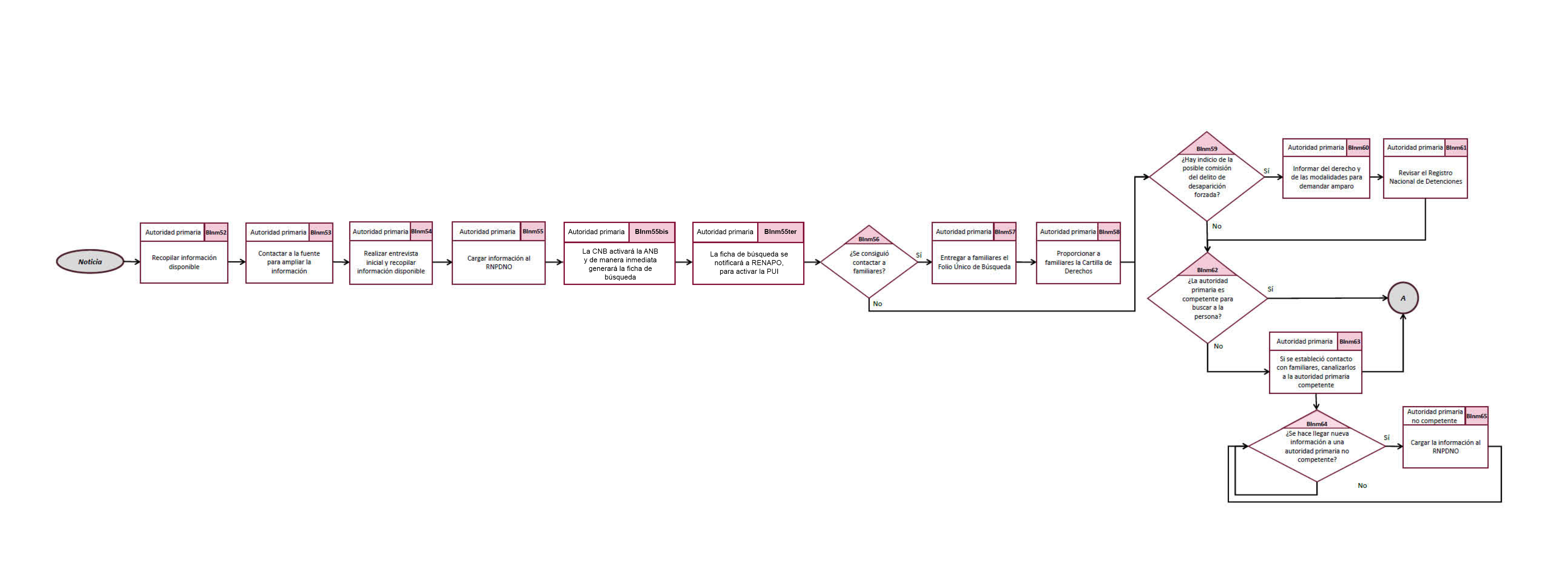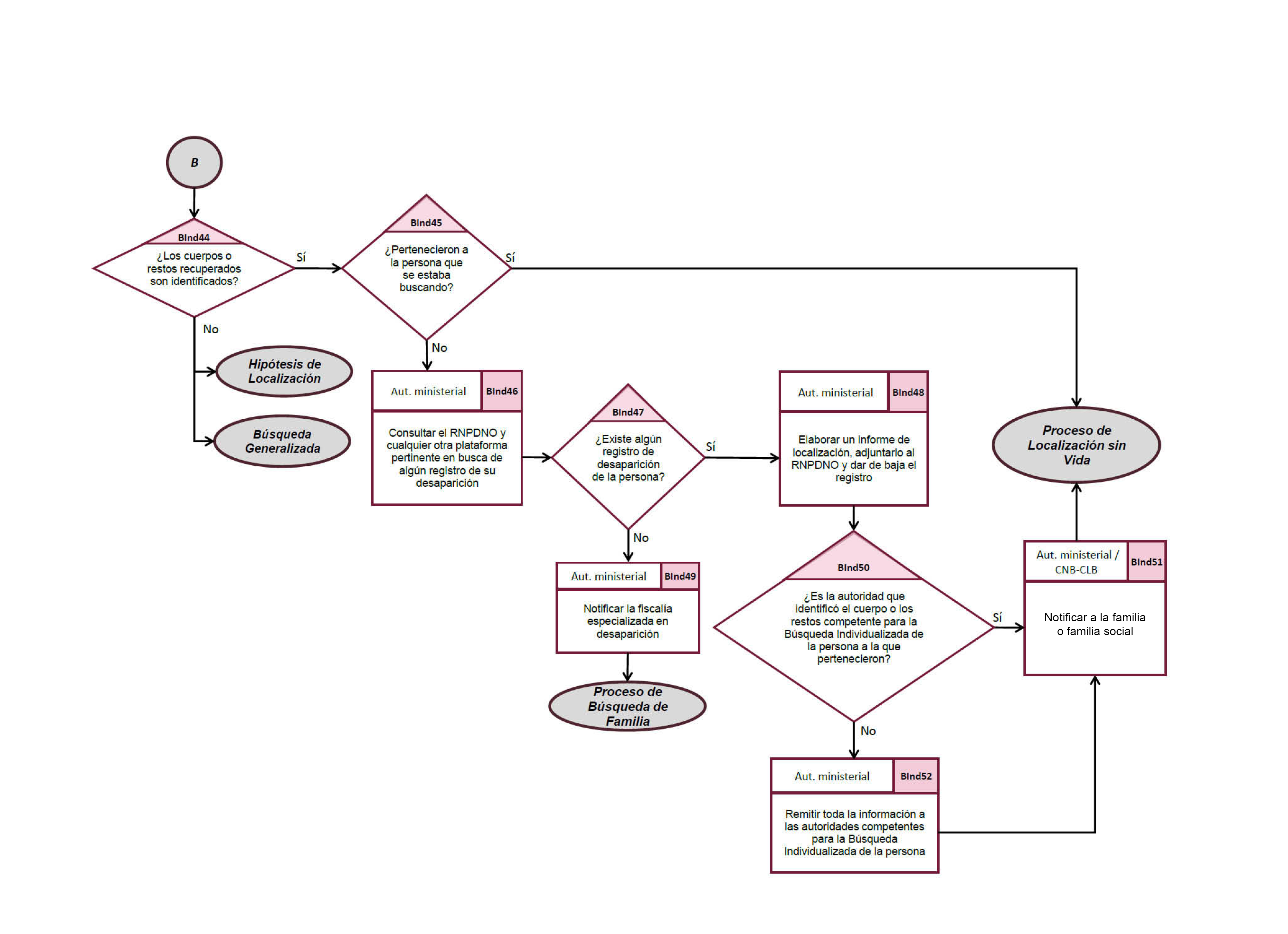 Agotados los análisis de documentación y de campo, se inició con los trabajos de construcción de las bases del protocolo a partir de un modelo de diseño de procesos organizacionales, es decir, del desarrollo de un macroproceso general para la búsqueda de personas, el cual implicó la delimitación de funciones, procesos y relaciones formales con el propósito de definir etapas.